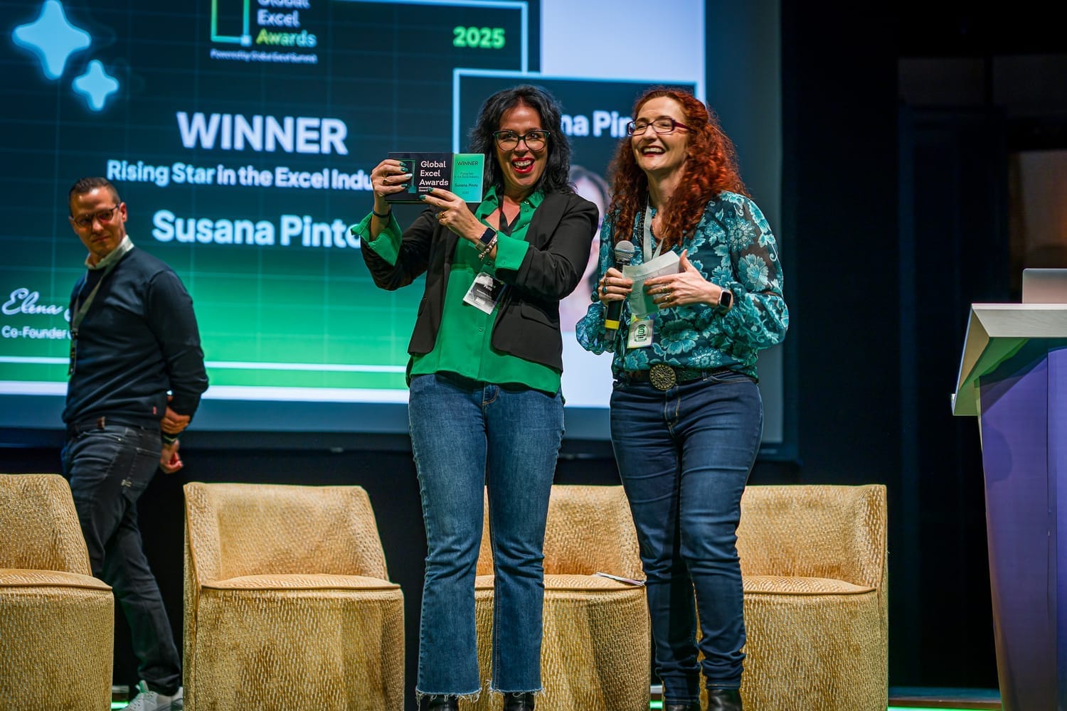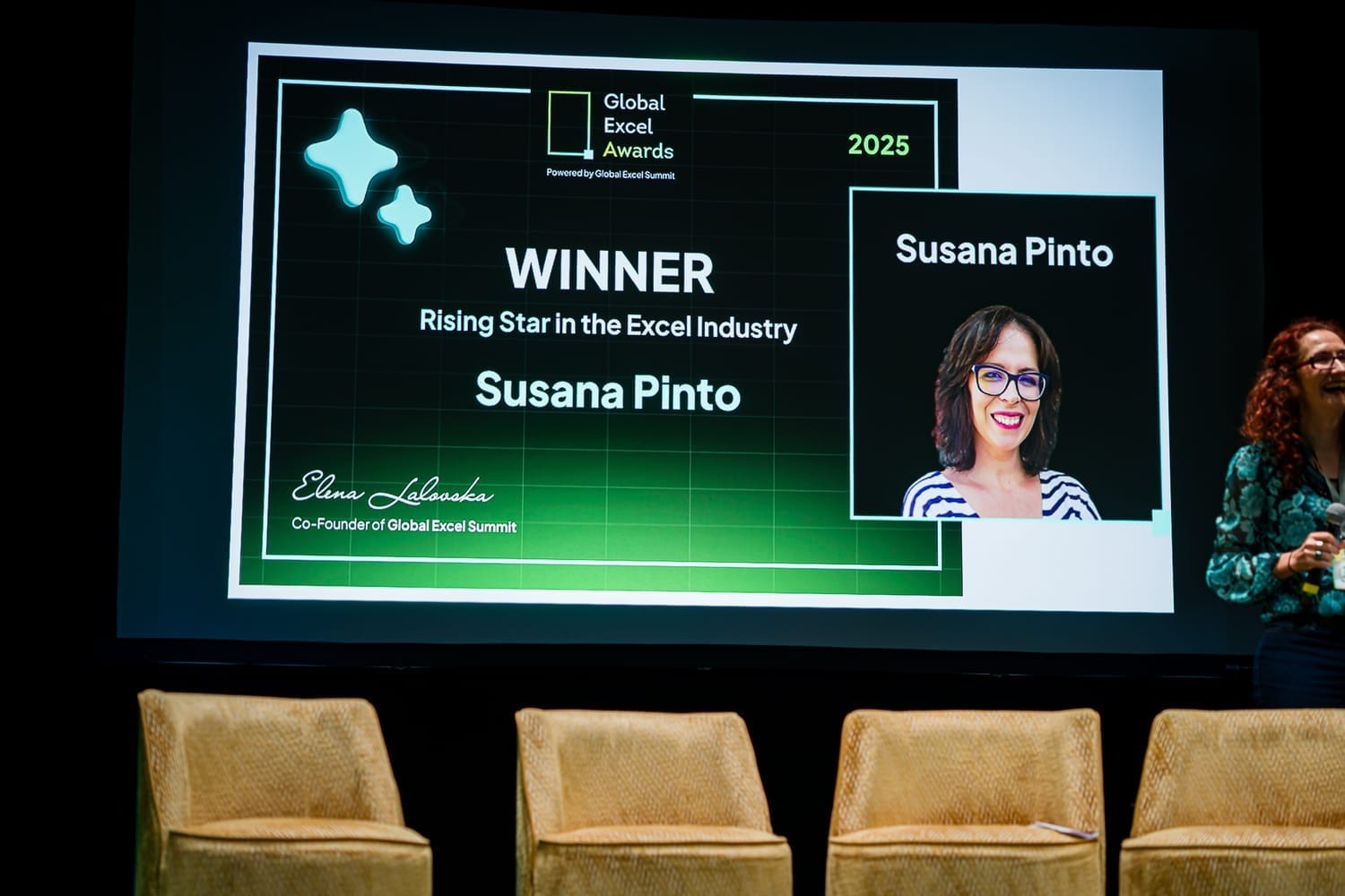Em fevereiro de 2025 subi ao palco do Excel Summit, em Londres, para receber o prémio “Rising Star Excel 2025” — um reconhecimento internacional que devo ao apoio dos meus alunos e comunidade.