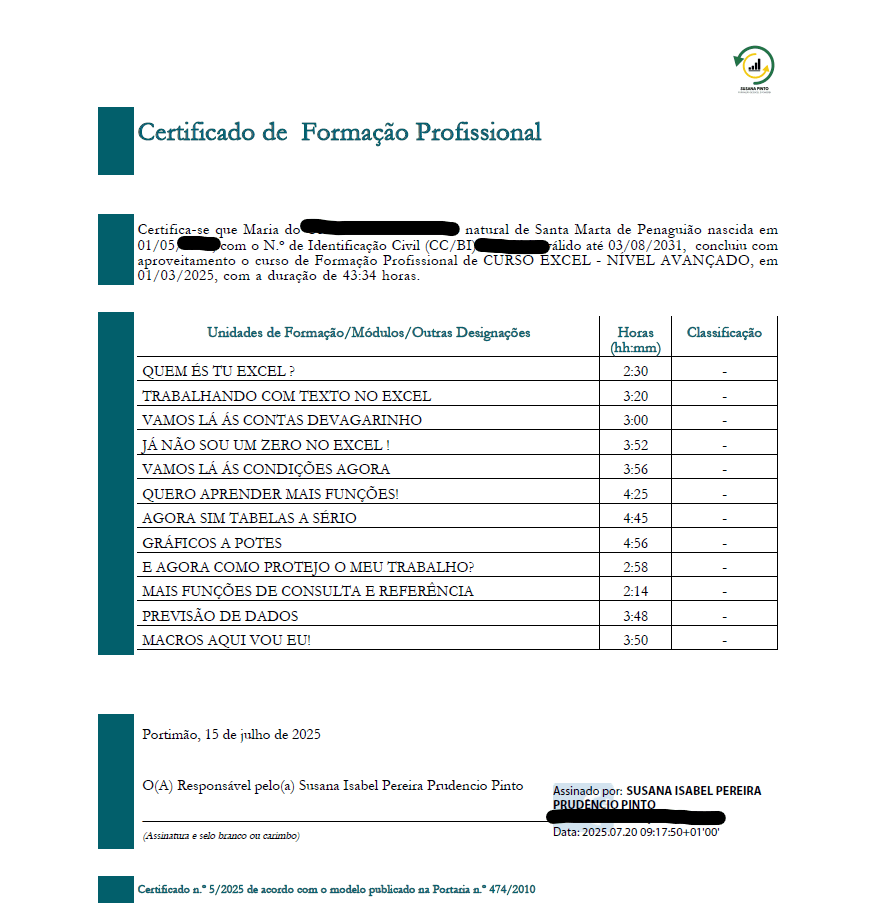 Se completar todas as tarefas propostas de todos os módulos no final tem direito a 2 certificados. O bonitinho para emoldurar e, o certificado profissional SIGO. Um certificado SIGO é um Certificado de Formação Profissional emitido pela Plataforma SIGO (Sistema de Informação e Gestão da Oferta Educativa e Formativa), um sistema informático português que regista e valida o percurso formativo dos cidadãos. Este certificado comprova a conclusão de ações de formação com aproveitamento e é automaticamente registado no Passaporte Qualifica de cada pessoa, a plataforma que reúne o seu registo individual de competências.